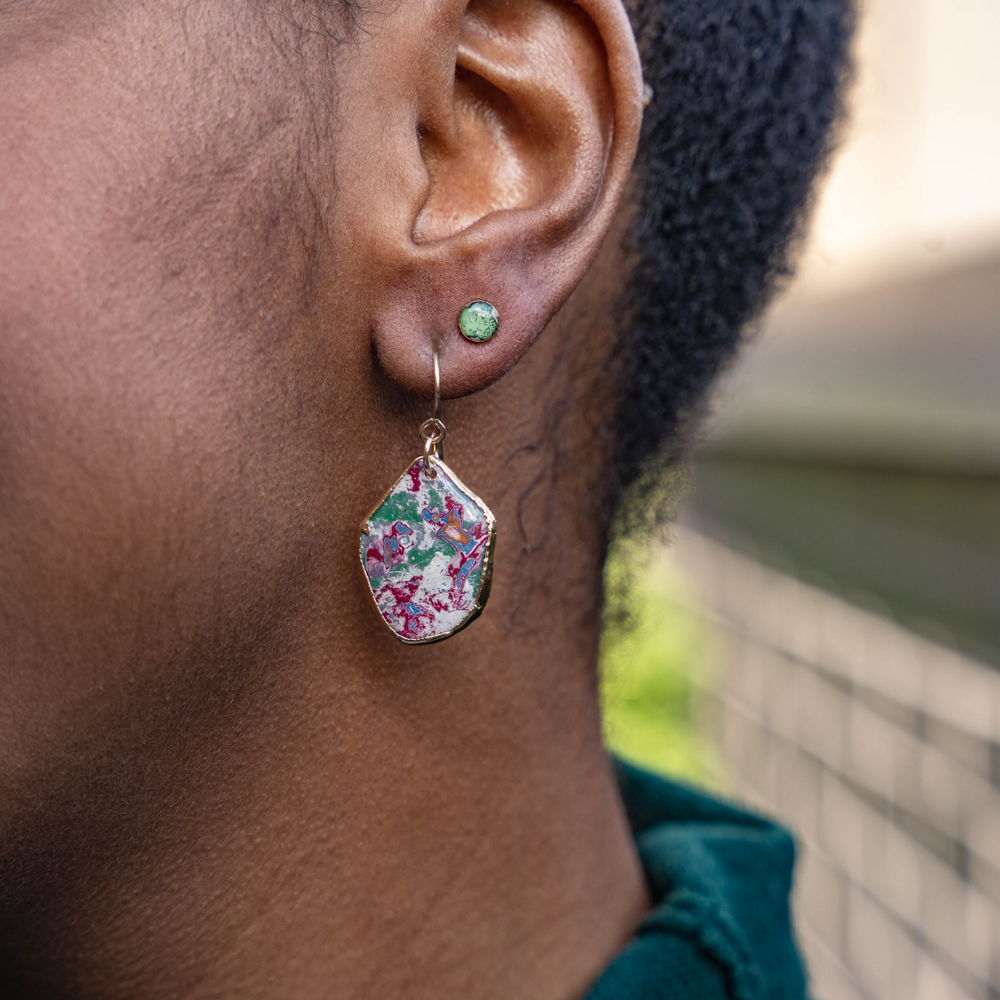 Handcrafted from start to finish by the Rebel Nell Creative Design team. The process begins with one of our team members identifying an area of graffiti that speaks to them. They then cut that piece out and attach it to a metal backing, followed by hand-cutting the metal backing to match the organic shape they designed. For a finishing touch, we electroplate each pair of earrings with gold - elevating this unique piece to that of luxury.
