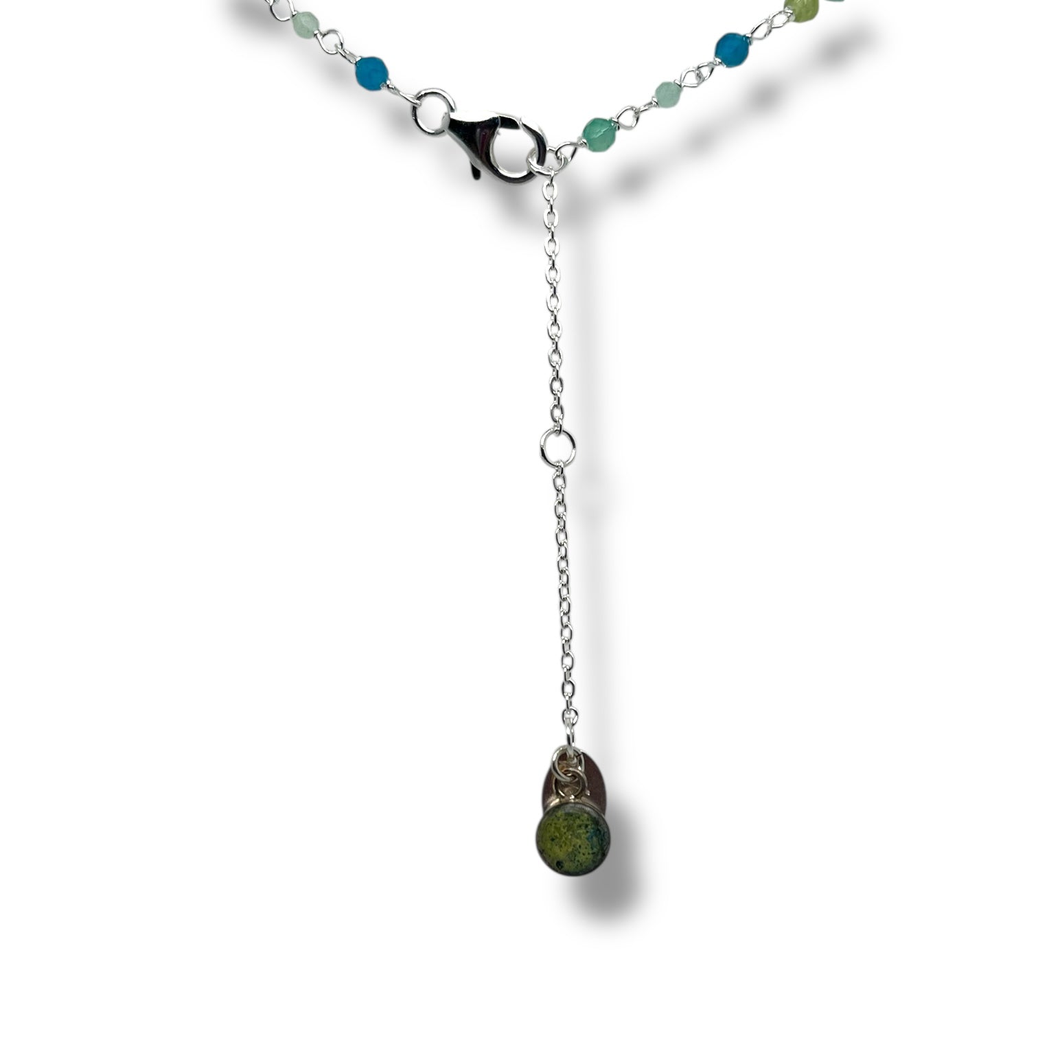 Material: Sustainably sourced peridot, green quartz, green onyx, blue apatite,  and repurposed graffiti