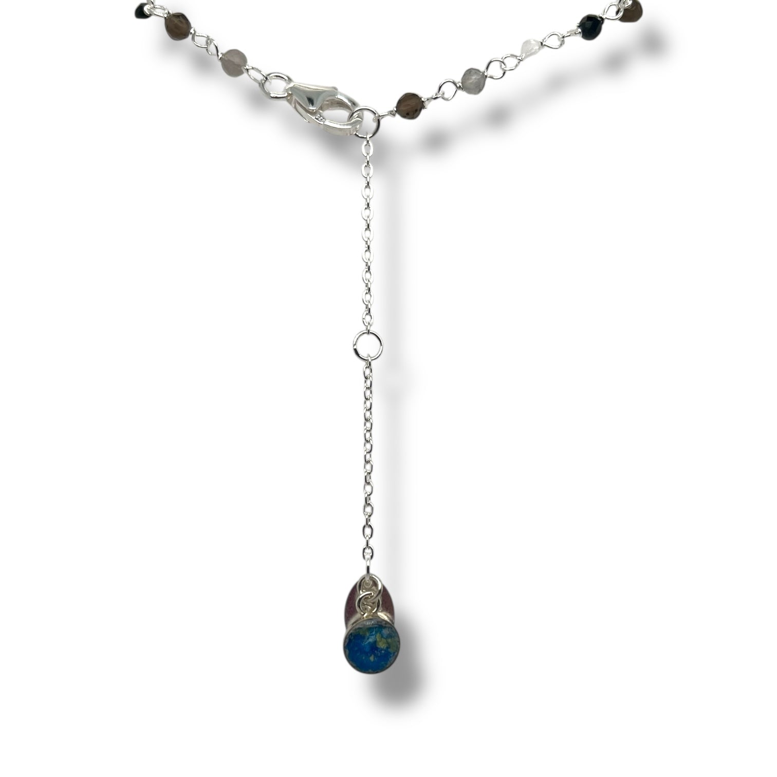 The Intuition Affirmation Necklace boldly encapsulates the essence of inner wisdom and spiritual guidance, seamlessly merging rainbow moonstone, black spinel, labradorite, and smokey quartz.