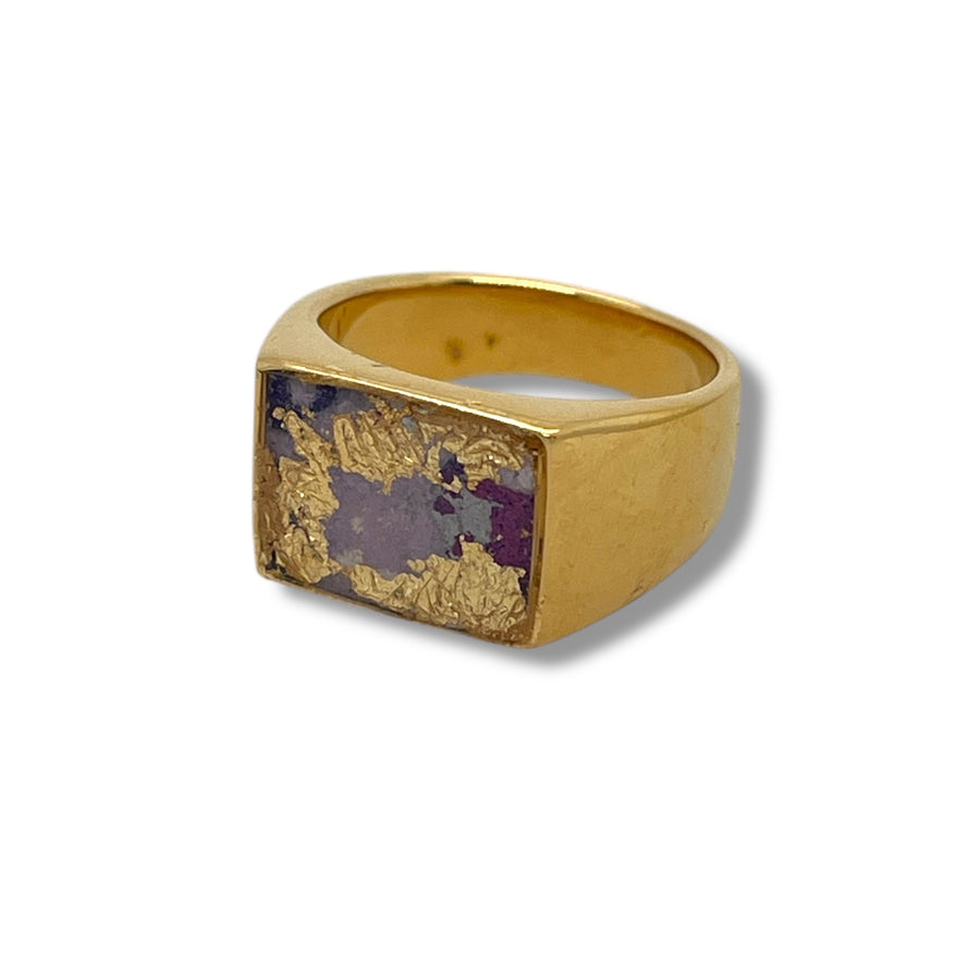Effortlessly cool, our Kim Ring is a classic signet. This gender-neutral style looks great on everyone! With its gold finish and repurposed paint from the campus rock, it’s sure to be a trendsetting staple in your jewelry collection.